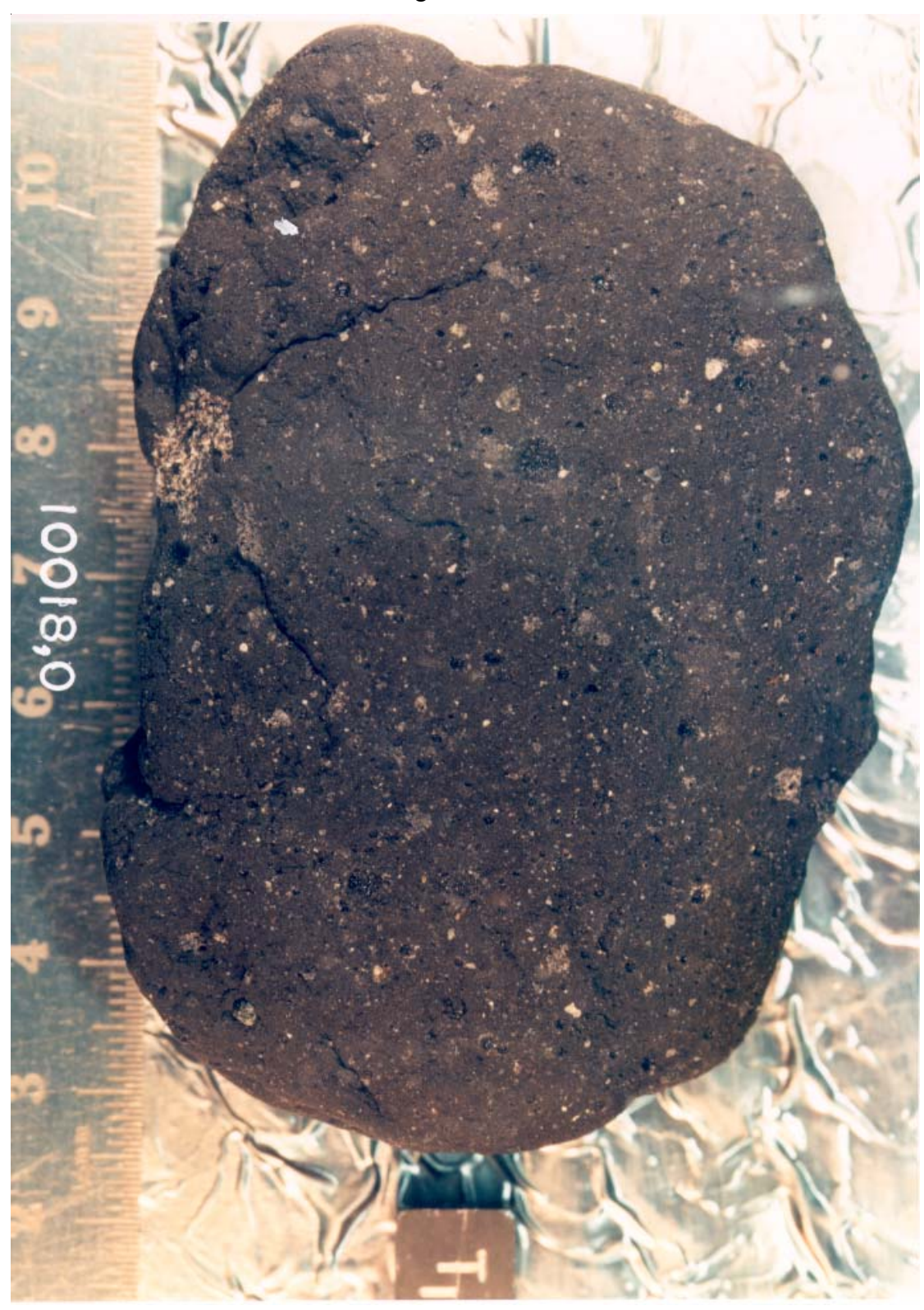 Section titled “Introduction”10018 is a coherent, glass-matrix regolith breccia (figure 1). Fruland (1983) included 10018 in the Regolith Breccia Workbook, but Phinney et al. (1976) and Simon et al. (1984) did not include it in their otherwise comprehensive studies.