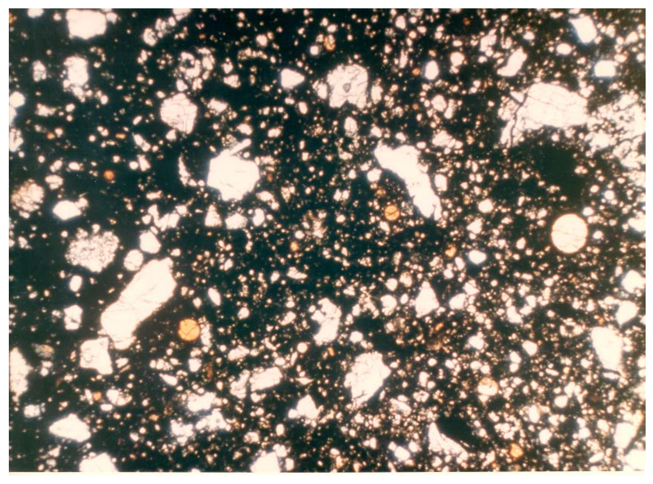 Figure 2: Photomicrograph of thin section of 10018. NASA #S70-49975 showing orange glass beads. Scale is 2.5 mm.