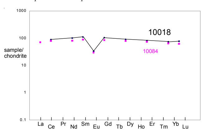 Figure 4: Normalized rare earth element diagram for breccia 10018 compared with soil 10084 (data from Philpotts et al. 1970).