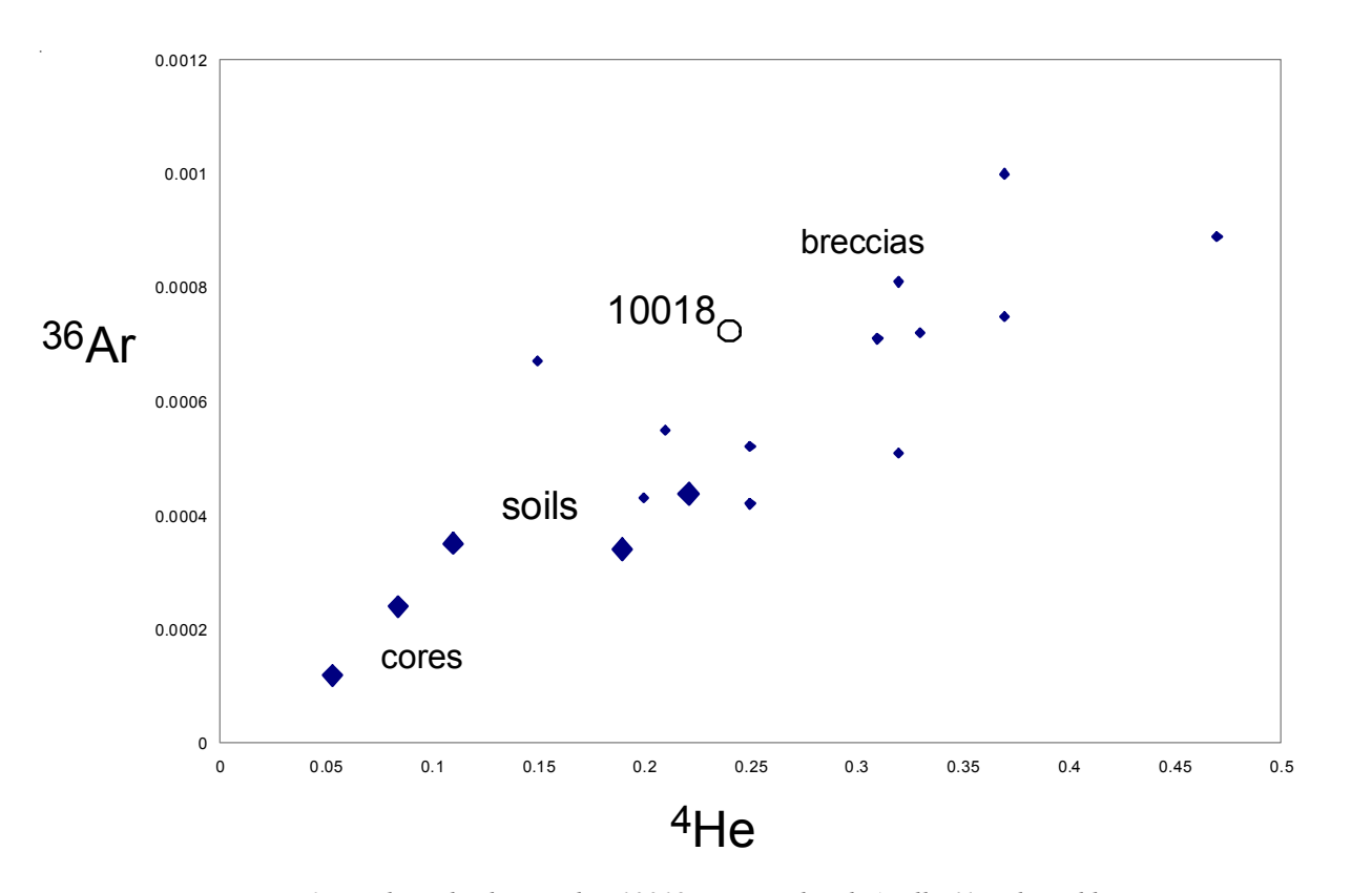 Figure 6: Implanted solar wind in 10018 compared with Apollo 11 soils and breccias (Funkhouser et al. 1070 and Hintenberger et al. 1976). Units STP cc/g.