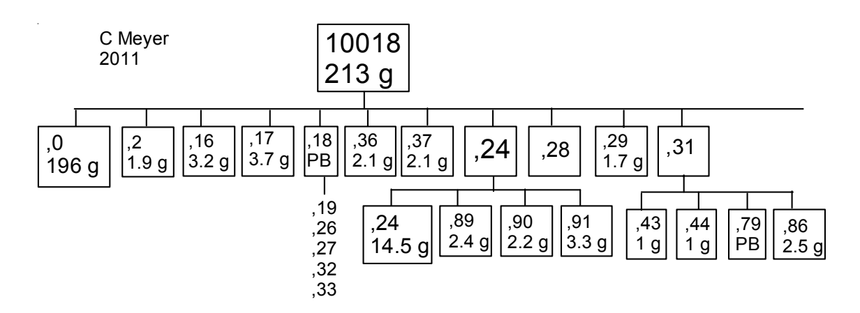 Schonfeld and Meyer (1972) calculated that 10018 was a mix of mare basalt with ~17 % gabboic anorthosite and ~3 % KREEP, while Rhodes and Blanchard (1981) found it was a mix of soil and high-K basalt. However, Simon et al. (1984) could not identify such a high percentage of highland component.