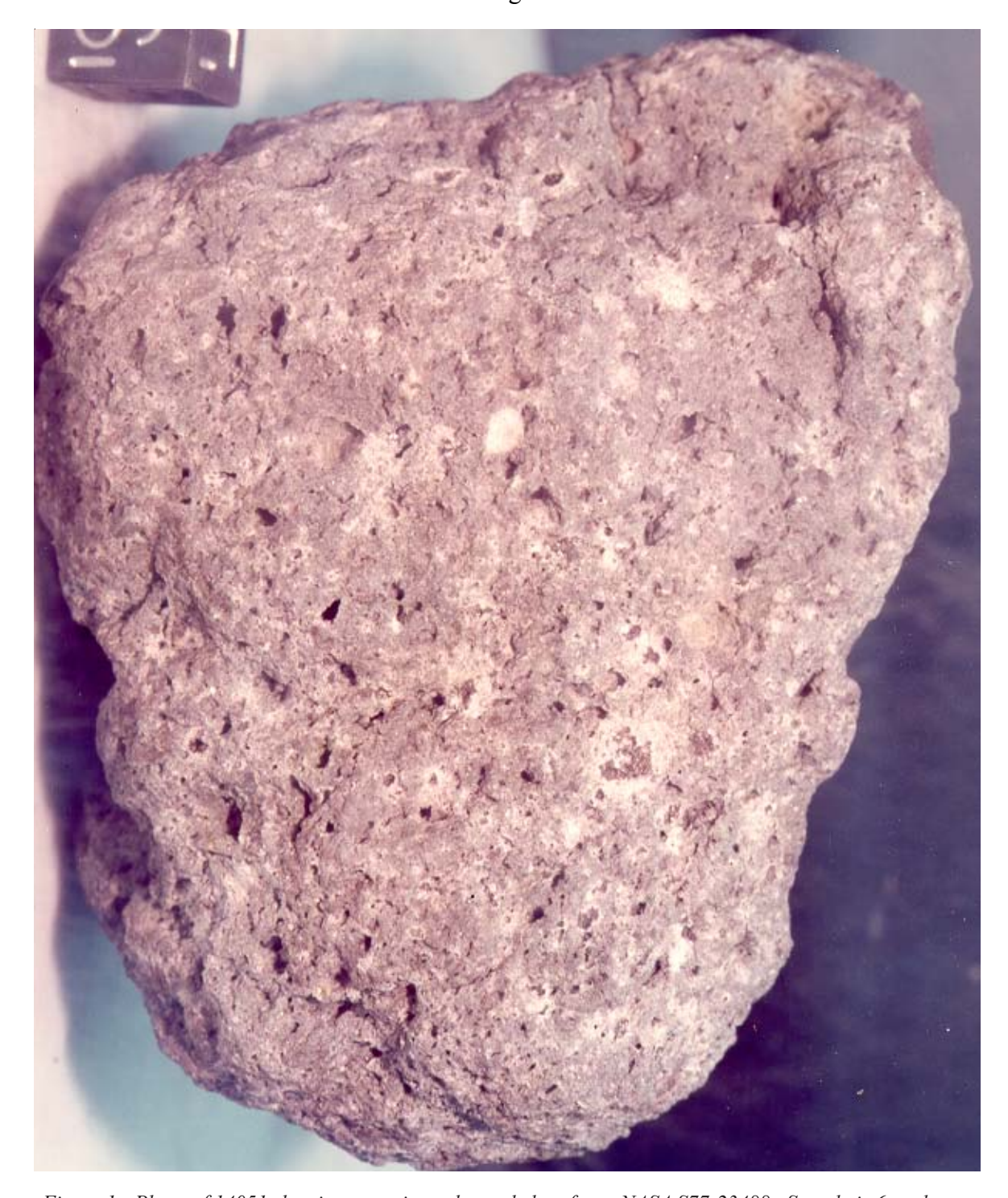 Figure 1: Photo of 14051 showing zap pits and rounded surface. NASA S77-23488. Sample is 6 cm long.