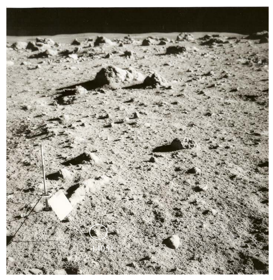 Figure 3: Photo of 14051 on lunar surface, with rim of Cone Crater in distance. AS14-68-9444.