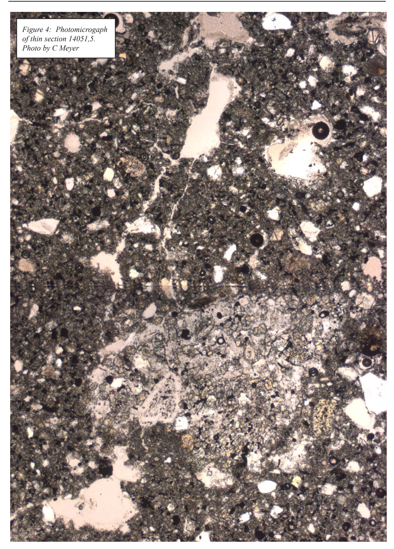 Section titled “Petrography”14051 has the texture of an “impact melt rock”, similar to the large boulders at Apollo 17. The fine grain matrix has recrystallized with formation of distinct grains of poikilitic ilmenite (figure 4). The void space has consolidated into distinct, millimeter-sized vugs and vesicles. Stadermann et al. (1991) give the mode.