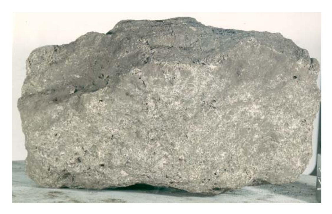 Figure 1: Photo of mare basalt 15058 (before dusting). NASA S71-44205. Sample is shaped like a brick about 6 inches long and 3 inches high.