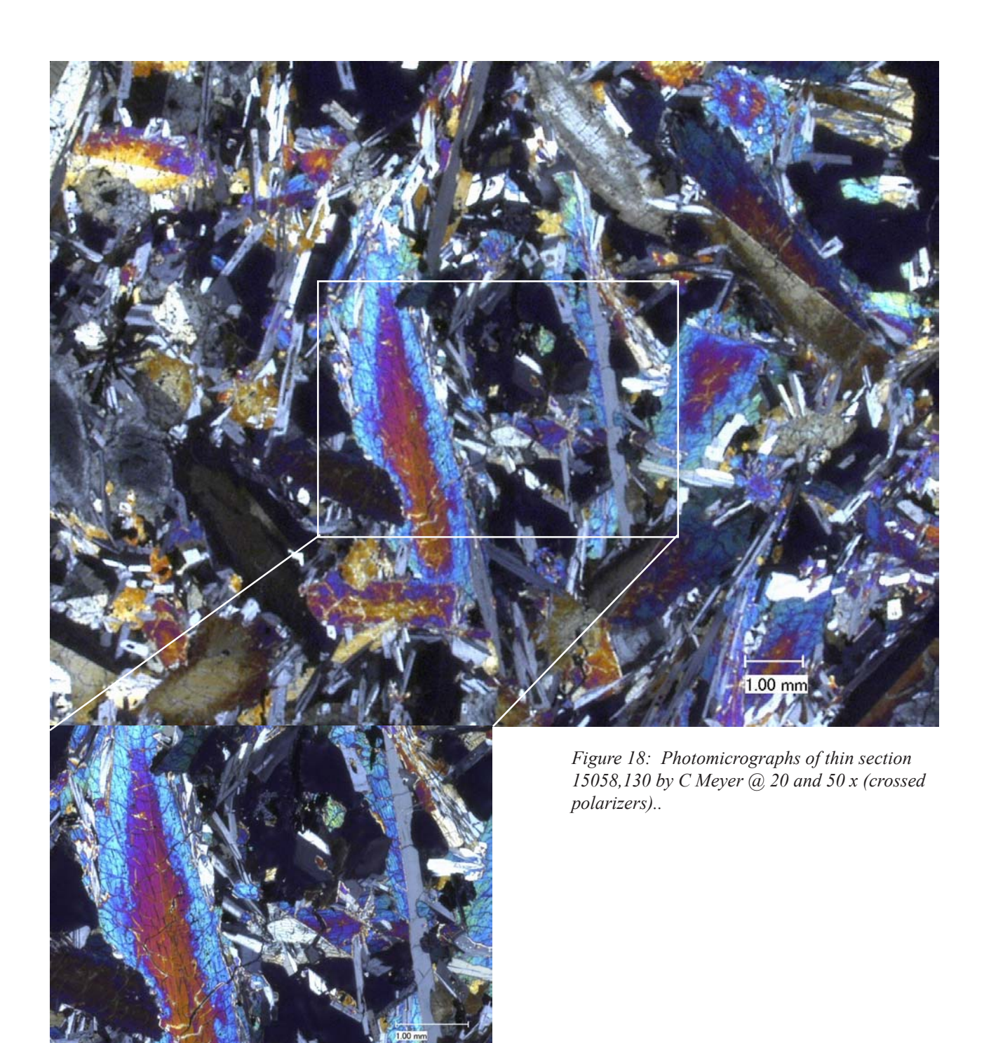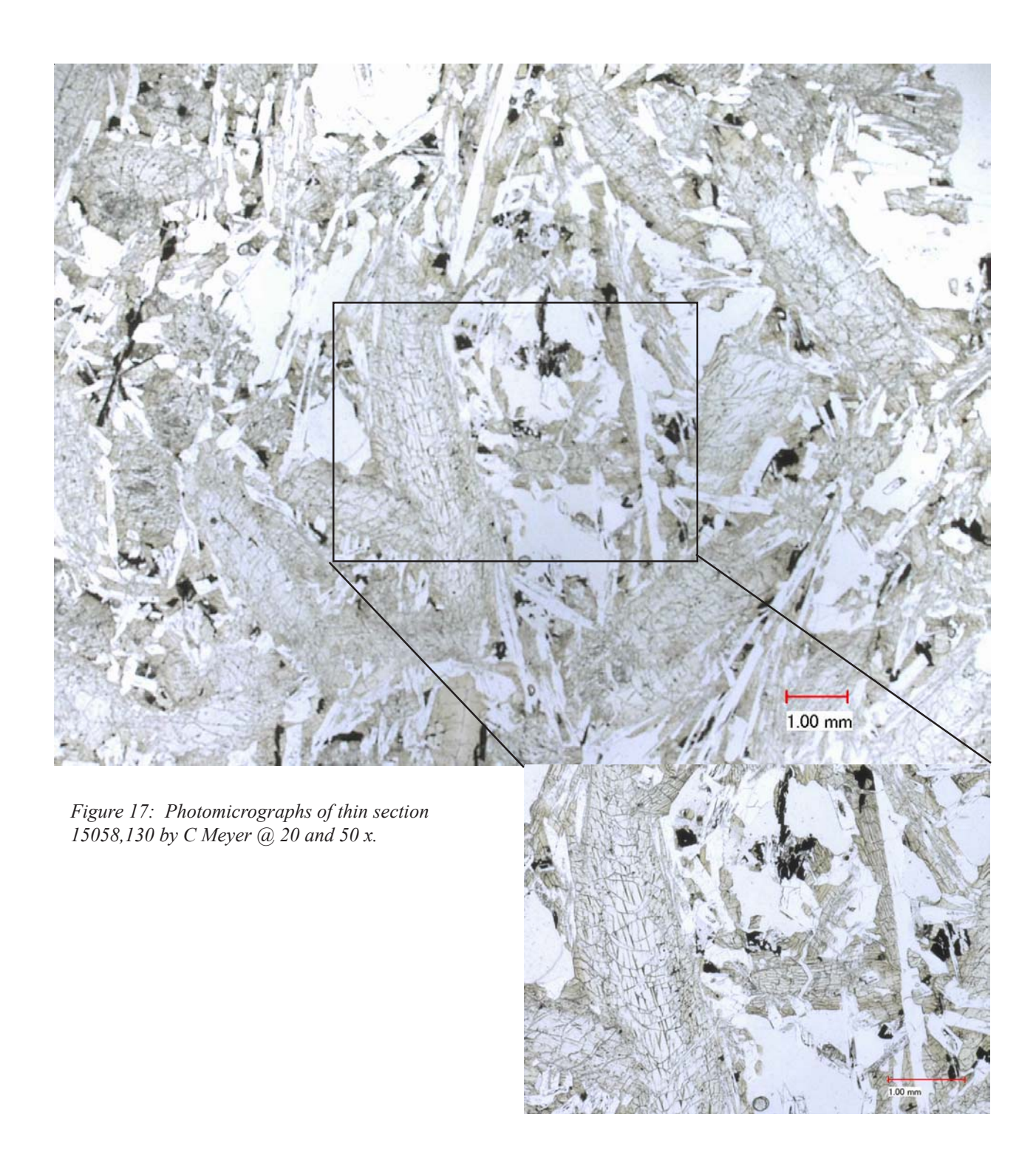 Section titled “Petrography”Ryder (1985), Bence and Papike (1972), Brown et al. (1972) and Gay et al. (1972) and Juan et al. (1972) describe the texture of 15058 and classify it as a pigeonite basalt. Large phenocrysts of pigeonite are green in the cores with brown rims. Although Rhodes and Hubbard (1973) reported rare olivine, the rock is quartz-normative. Olivine is restricted to cores of large pigeonite. Clusters of radiating plagioclase crystals are common (figure 3). Vugs contain pyroxene and plagioclase with diktytaxitic texture.