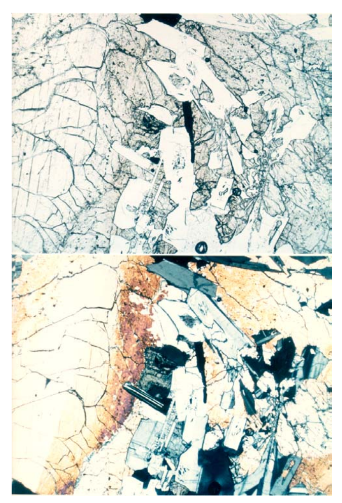 Figure 2: Thin section photomicrgraphs of 15058 showing large pyroxene phenocryst (left) and subophitic texture. Top is plane polarized light; bottom is crossed polarized. NASA S71-51746 and 747. Scale about 1 mm.