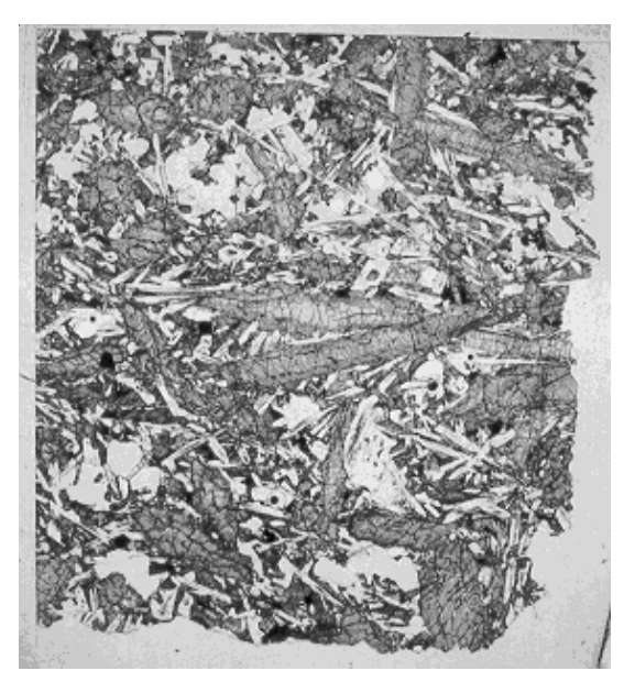 Figure 4: Closeup photomicrograph of thin section 15058,14 illustrationg hollow plagioclase needles (straws). Scale about 3 mm.
