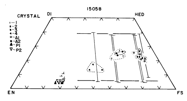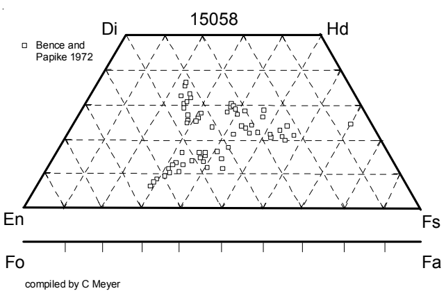 Section titled “Mineralogy”Pyroxene: The pyroxenes in 15058 are long – up to 2 cm in length – and highly zoned. Bence and Papike (1972) reported analyses of pyroxene in 15058 (figure 5). Papike et al. (1976) reported the cell dimensions of pyroxene crystals. Burns et al. (1972) discussed the charge balance and color of transition elements. Papike et al. (1972) discuss pyroxene exsolution and note that the coes of large pigeonite are not exsolved.