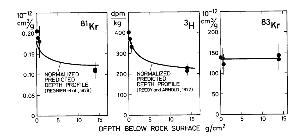 received most of its cosmic ray irradiation in a “shielded location” (beneath the regolith) and finally being exposed to solar irradiation for the last million years right at the lunar surface. Eugster et al. also found that 81Kr, along with 3H (tritium), was enhanced in the surface.