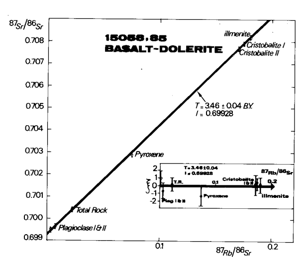 Section titled “Radiogenic age dating”Husain (1974) and Birck et al. (1975) determined the crystallization age of 15058 by Ar/Ar plateaus and Rb/Sr ischrons (figures 9 and 10).