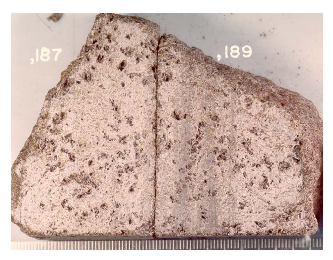 Figure 13: Interior sawn sufaces of 15058. NASA S76-24636. Note long pyroxene needles extending through vugs with diktytaxitic texture. Scale is mm. These are two of the samples on public display.
