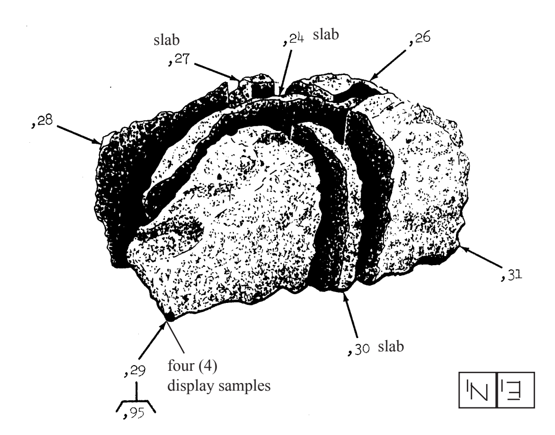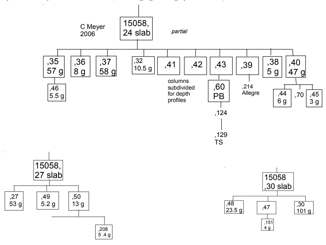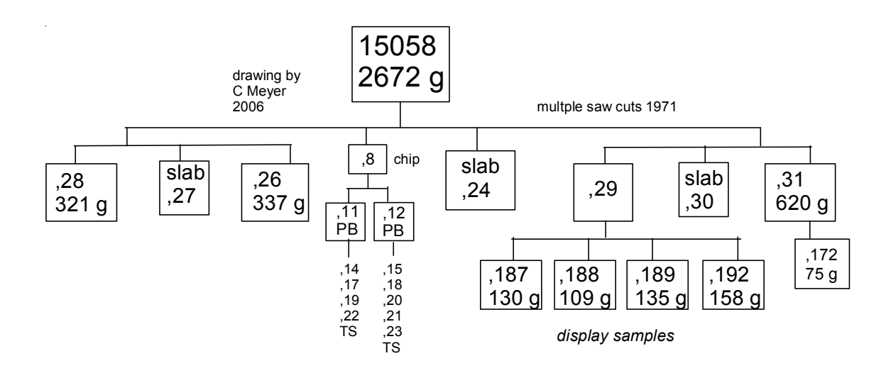Section titled “Processing”First a long slab was cut (figure 15), then a compound slab was cut at right angles by cutting slabs from each side piece (figure 16). A long thin column was cut from the center of the first slab (,32). This sample was much allocated, especially to science labs wishing to study “physical properties”. There are 18 thin sections of 15058.
