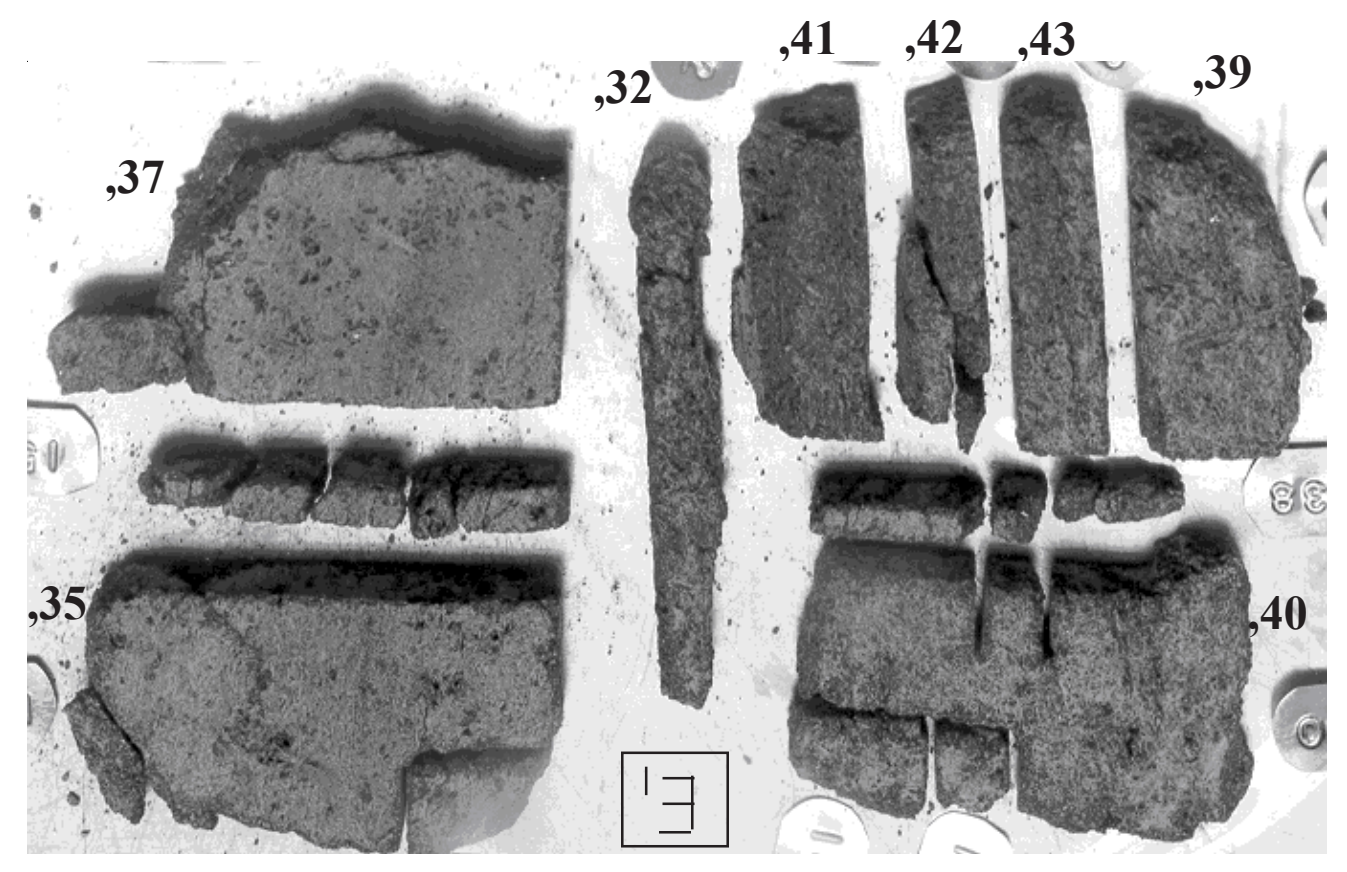 Figure 15: First slab (,24) cut lengthwise through 15058. Columns ,41 ,42 ,43 were further subdivided to provide samples with known depth profiles. NASA S72-15241. Central column not allocated. End piece ,39 was substantially subdivided for most allocations (including age dating by Birck et al.)