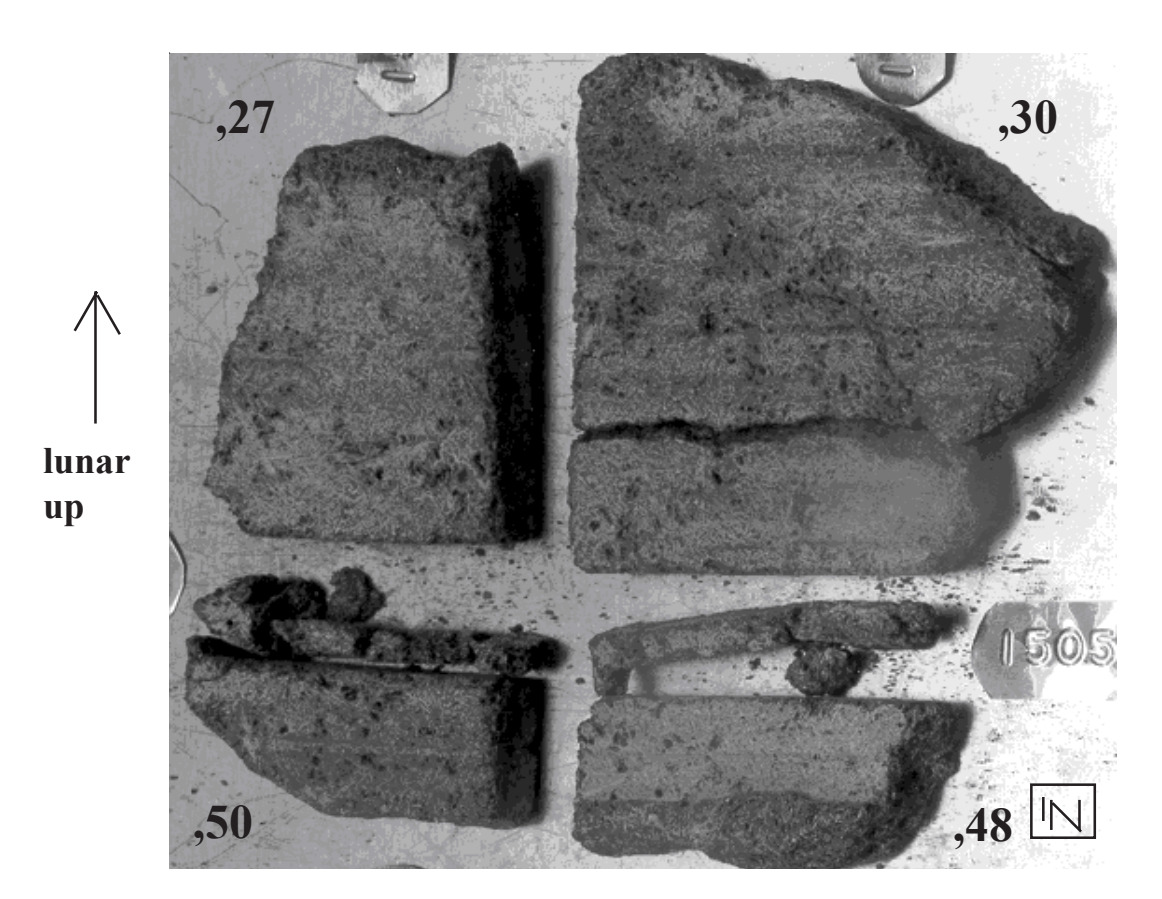15058 is one of the largest basalts returned from the moon, but its lunar orientation is not known with much certainty. The catalog records a few zap pits of the B1, W1and E1 surface, none on T1, N1 or S1. The sample has been shown to have a multistage exposure history (Eugster et al. 1984) and has been used for numerous studies of cosmic ray tracks.
