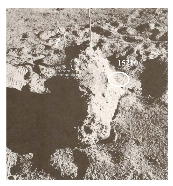Figure 1: Photo of boulder with location of 15211. AS15-86-11558.