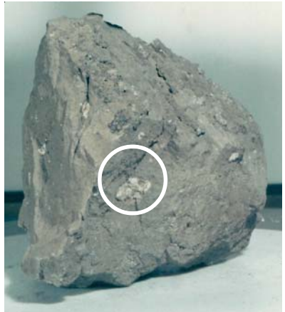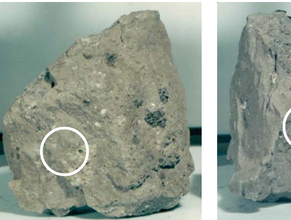 Figure 2: Two sides of 15266 showing two clasts. Sample is about 5 cm across. S71-44170 and 44172.
