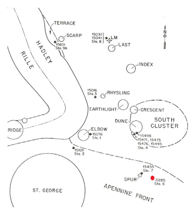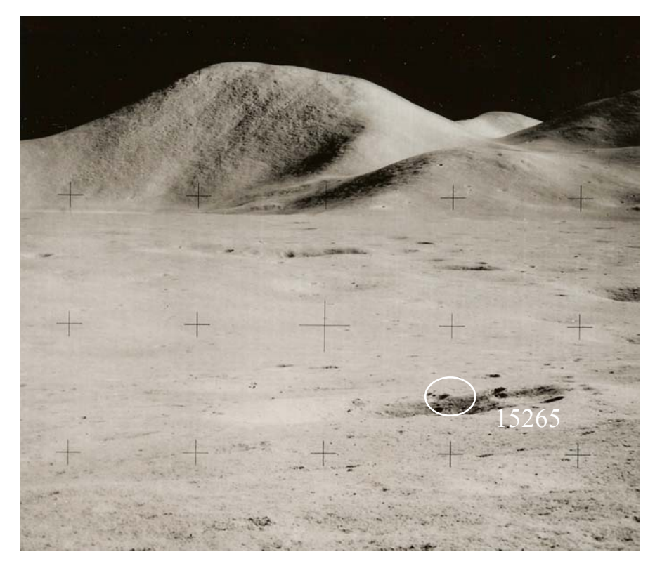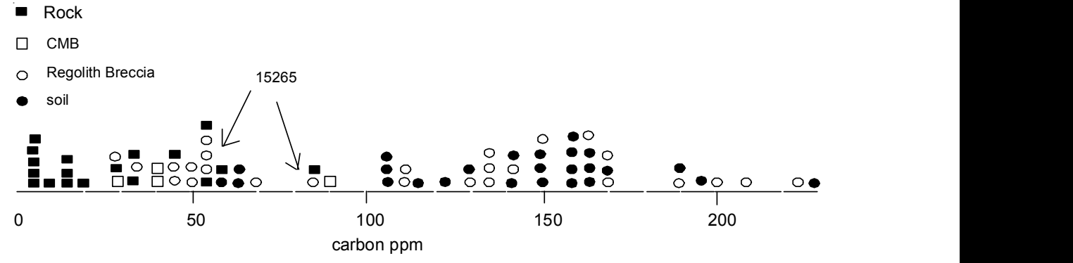 Moore et al. (1973) determined 57 ppm carbon for 15265 (figure 10). Kaplan et al. (1976) reported 76 ppm carbon, 41 ppn nitrogen and 870 ppm sulfur (including isotopic analysis). Figure 4: Location of 15265, 15266.