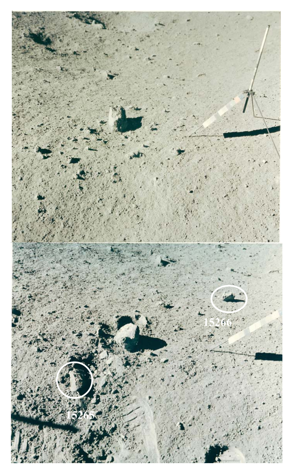 Figure 5: Before and after photos of small rock, broken by astronauts to yield 15265 and 15266. AS1586-11635 and 639. Gnomon is 50 cm.