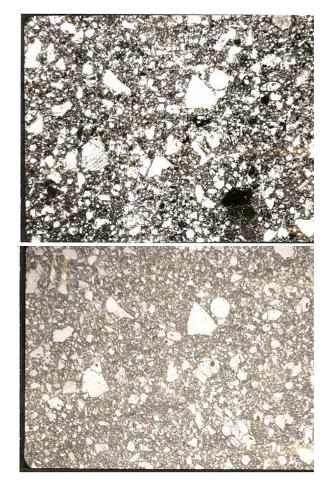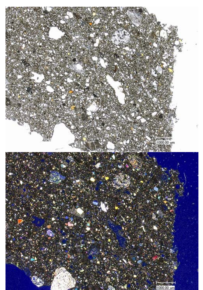 Figure 6 a,b: Transmitted and reflected light photomicrographs of thin section of 15265. Field of view is 2 mm.