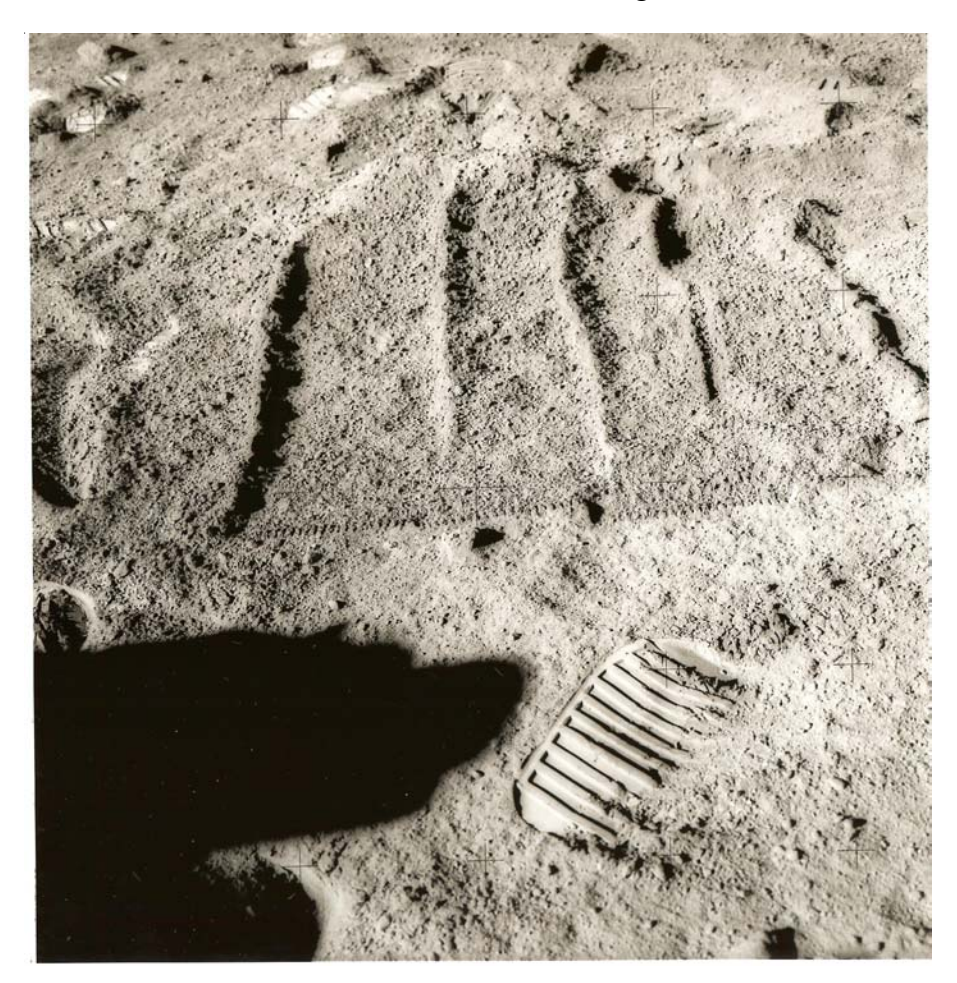 Figure 1: Surface photo of raked area at station 9a, about 20 meters from Hadley Rille. See section on 15600. AS15-82-11155.