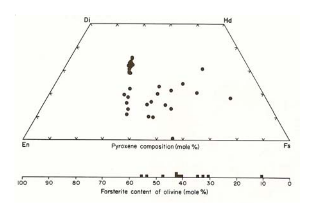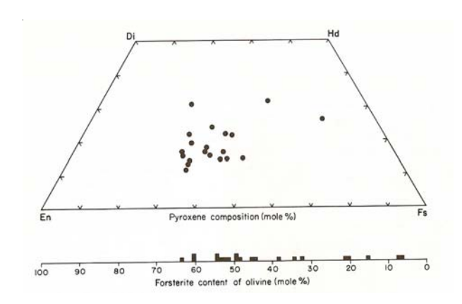 Figure 9: Pyroxene and olivine composition of Figure 8: Pyroxene and olivine composition of 15623 (Dowty et al. 1973). 15620 (Dowty et al. 1973).