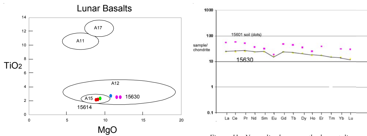 Figure 11: Normalized rare-earth-element diagram for 15630, with 15601 soil for comparison.