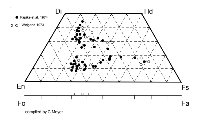 Section titled “Mineralogy”Pyroxene: Weigand (1973) and Papike et al. (1973) give pyroxene data (figure 3). Augite cores contains up to $3.5 % \text{ TiO}_2$ , $4.3 % \text{Al}_2\text{O}_3$ and $1% \text{Cr}_2\text{O}_3$ (Weigand 1973).