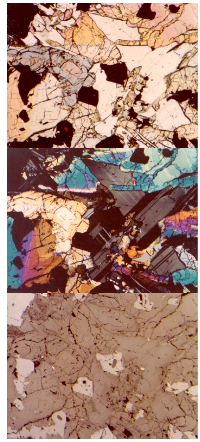 Figure 2: Photomicrographs of thin section 70035,14. Each view of same area, 2.7 mm wide. a) Partially polarized light #S79-26730, b) crossed-polarized light #S79-26631, c) reflected light #S79-26729.