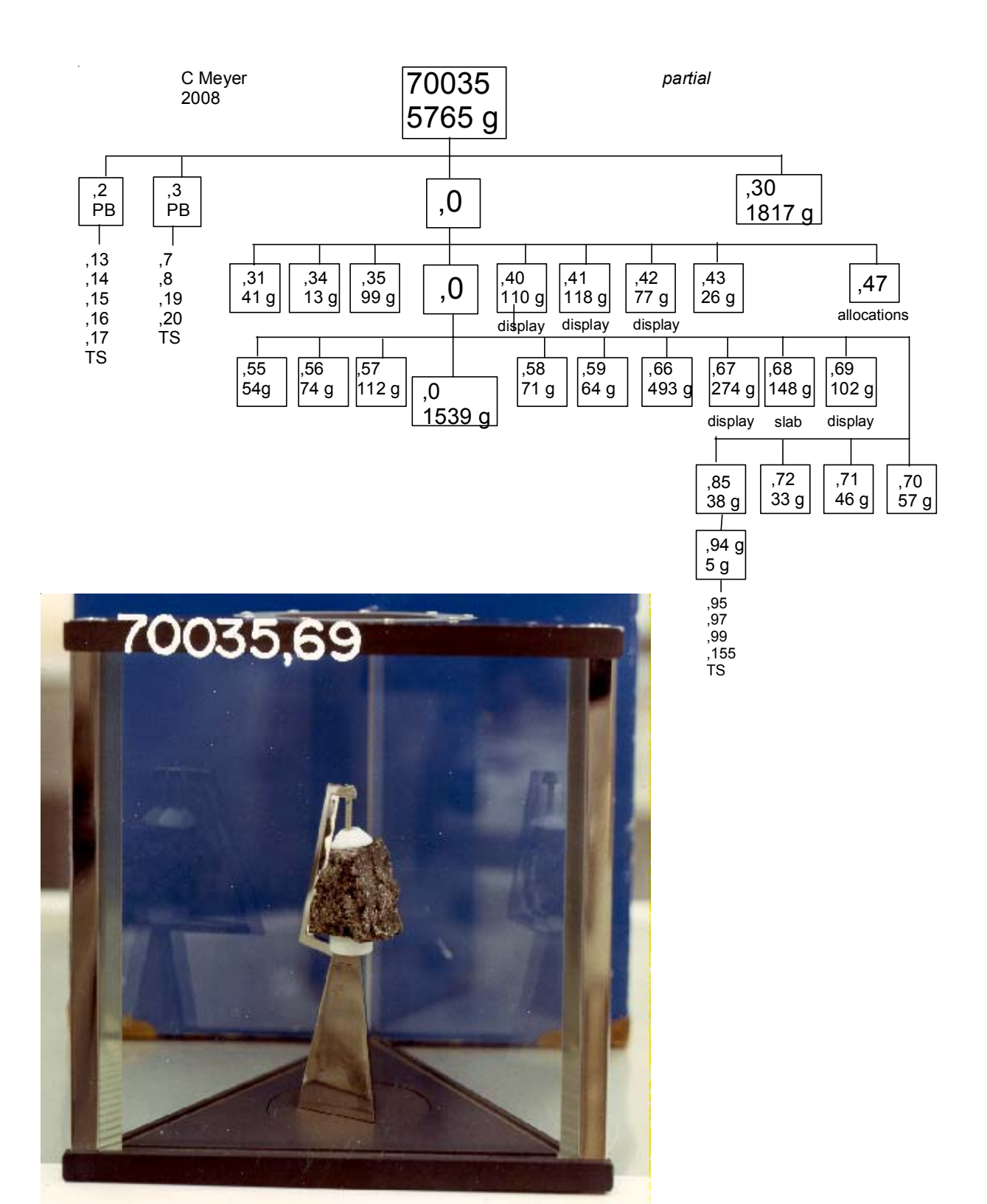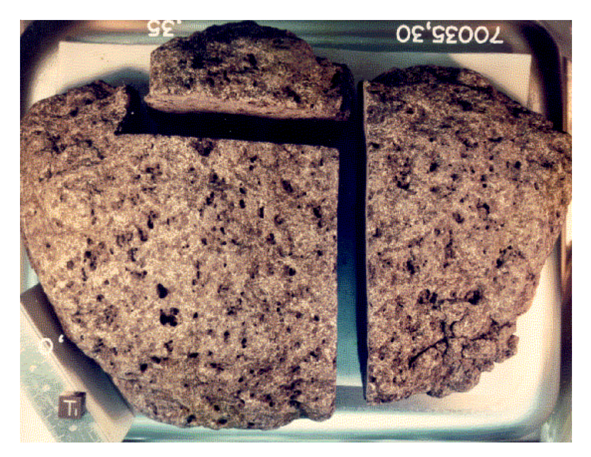 Section titled “Processing”According to the Apollo 17 Catalog (Butler 1973; page 39), 70035 was opened in the Command Module and studied by Jack Schmitt who picked it up with bare hands (permission granted).