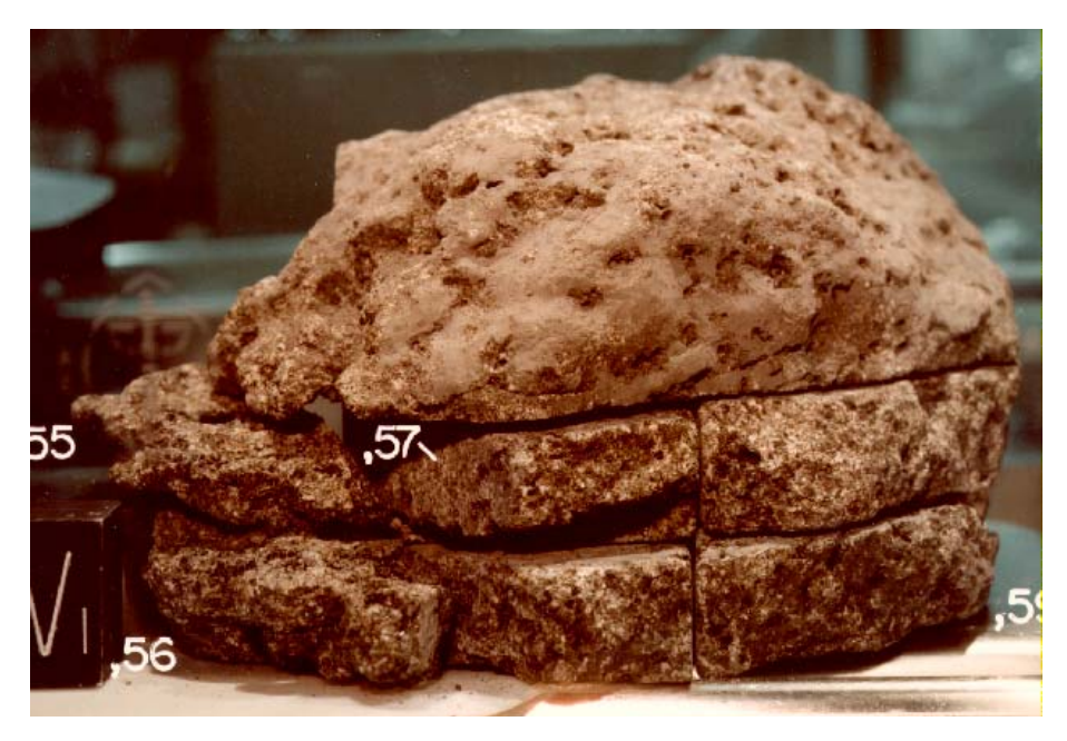 This rock is discussed in great detail in the Apollo 17 catalog by Neal and Taylor (1993). It has been sawn on two occasions (1973 and 1981) (figures 10-11). Nine pieces are used for public display (figure 12).