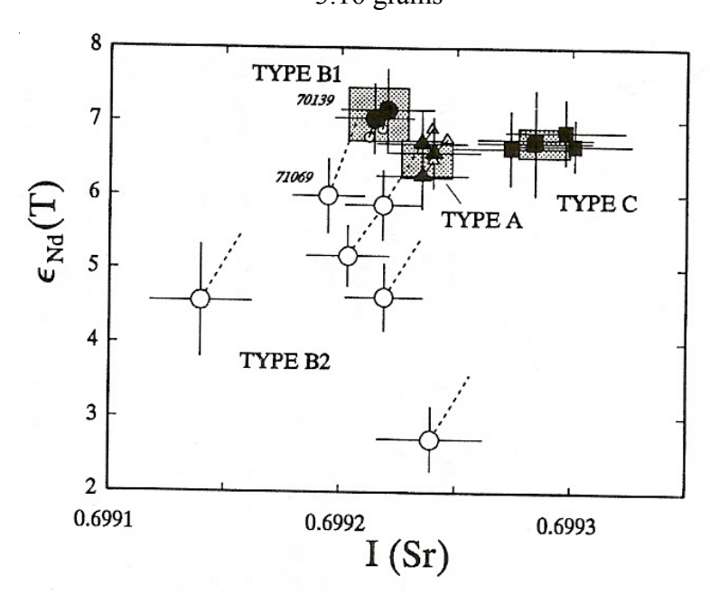 Figure 1: Diagram of initial Sr and Nd isotopes for 3.7 b.y. old high-Ti mare basalts at Apollo 17 (Paces et al. 1991).