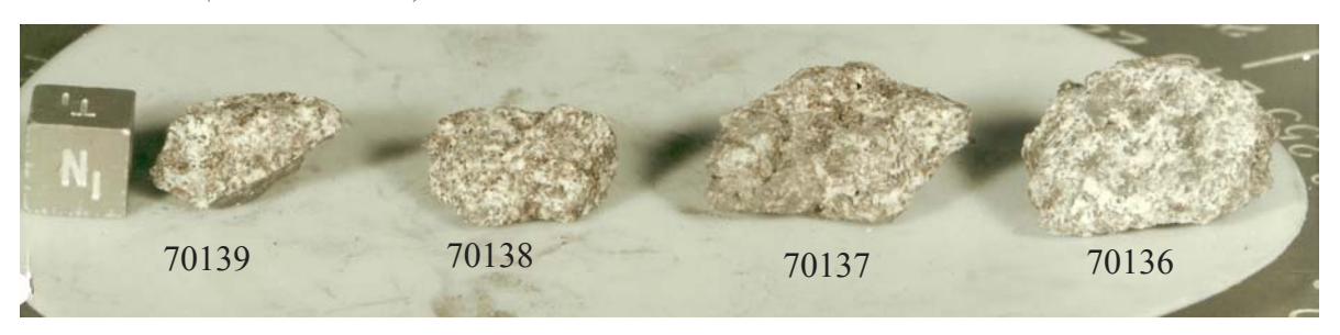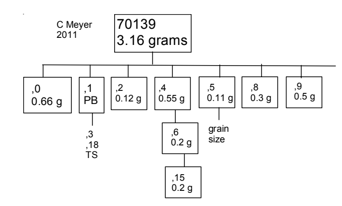Section titled “Radiogenic age dating”Paces et al. (1991) dated 70139 at 3650 ± 120 m.y. by Rb/Sr internal isochron and 3710 ± 120 m.y. by the more reliable Sm/Nd method. This is concordant with the age for 70135 as determined by Nyquist et al. (1975).