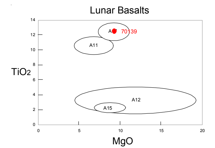 Section titled “Chemistry”70139 (and 70135) are high-Ti mare basalts (figure 3). The REE pattern is lower than that of most other Apollo 17 mare basalts (figure 4). Please compare with composition of 70135.