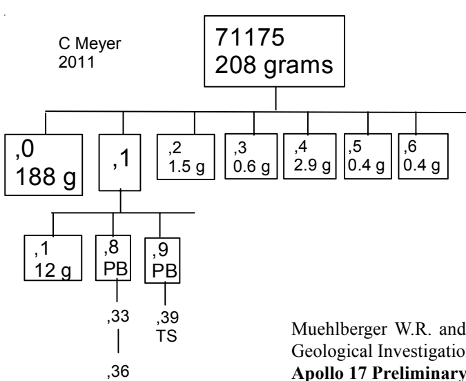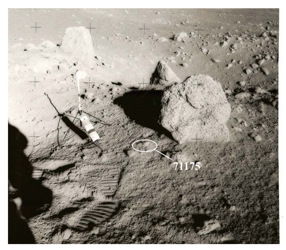 Section titled “Introduction”71175 is an equigranular basalt found partially buried near the 71135 – 71155 boulder (figure 1). It has not been adequately studied and has not been dated – although all Apollo 17 basalts are 3.72 b.y. old.