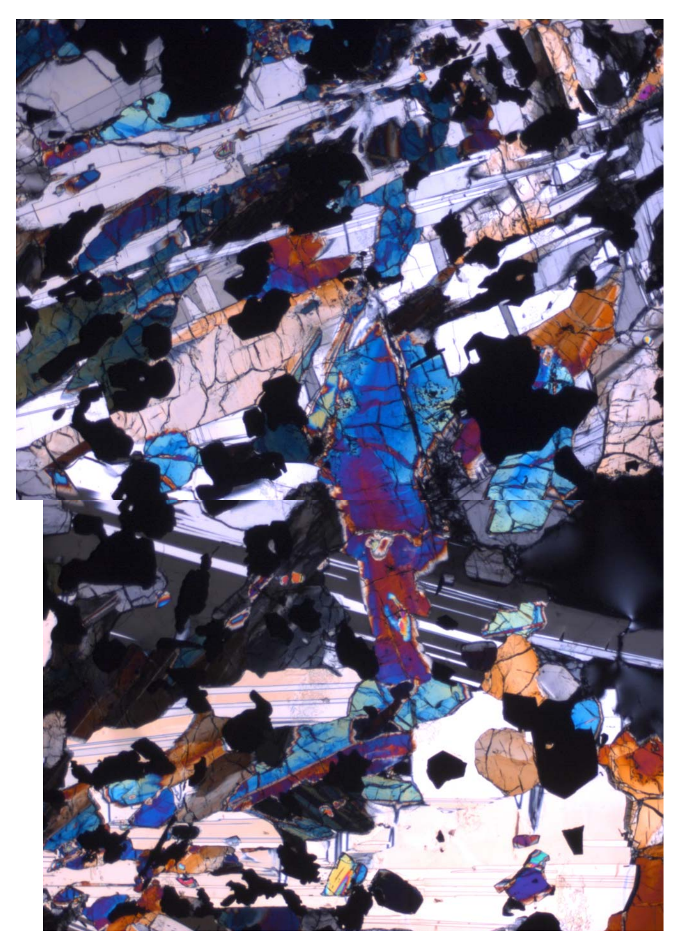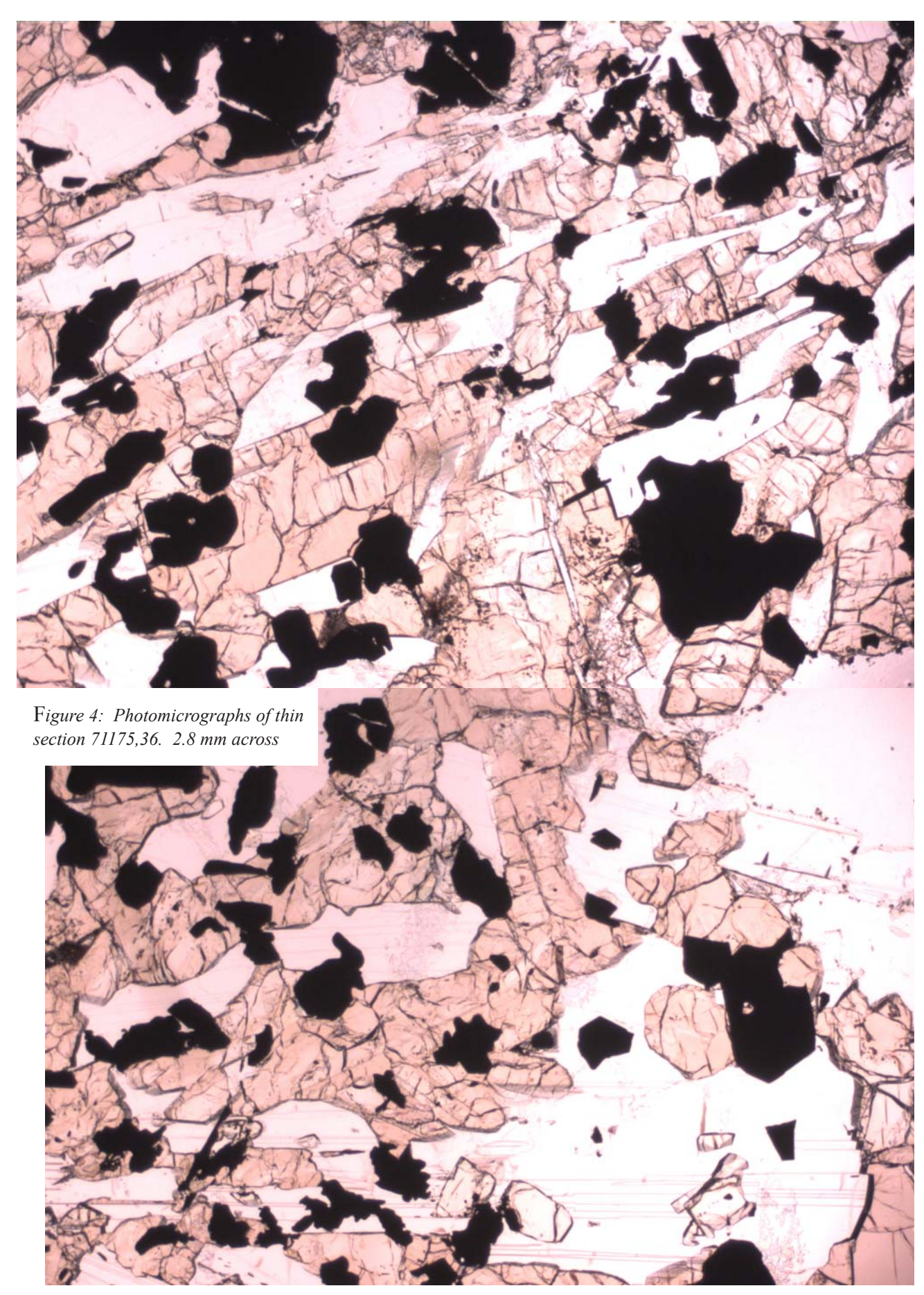 Section titled “Petrography”71175 has a subophitic texture with long crystals of plagioclase (> 2mm) intergrown with pyroxene (figure 6). Abundant equigranular ilmenite is sprinkled throughout. Large (up to 0.8 mm) regions of silica are reported (Neal and Taylor 1993).