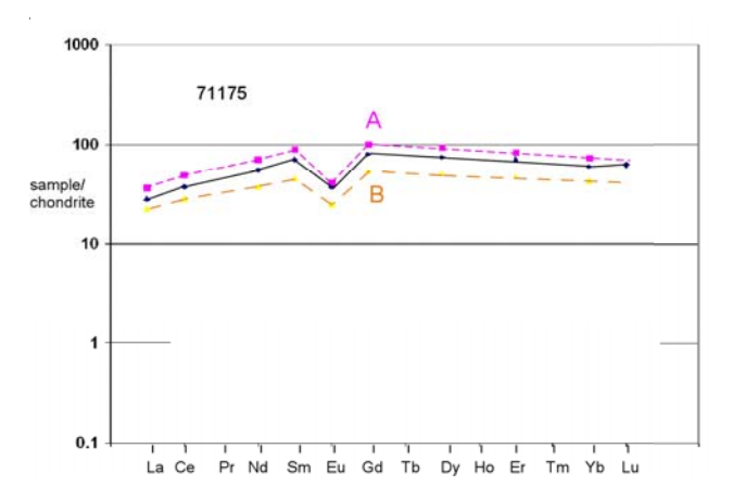 Figure 7: Normalized rare-earth-element diagram for 71175 and type A and B basalts.