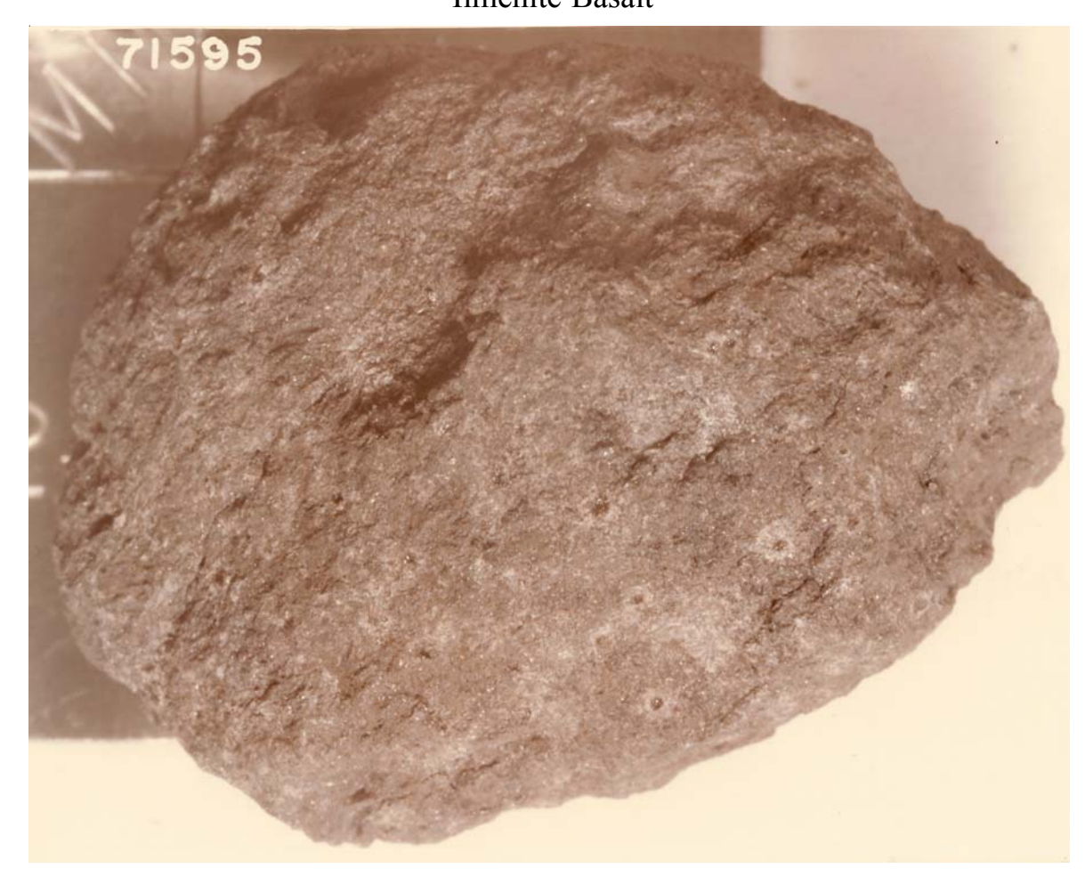 Section titled “Introduction”71595 is an olivine-microporphyritic ilmenite basalt similar to 71576 (Warner et al. 1978). It has been rounded by micrometeorite bombardment.
