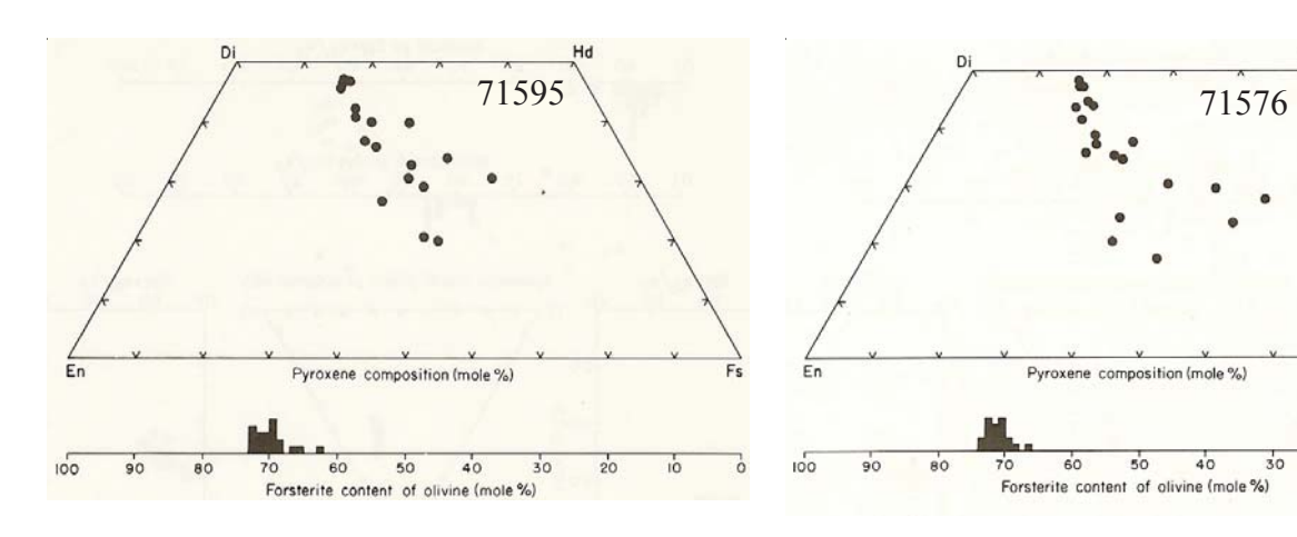 Figure 3: Pyroxene and olivine composition in 71595 and 71576 (Warner et al. 1978).