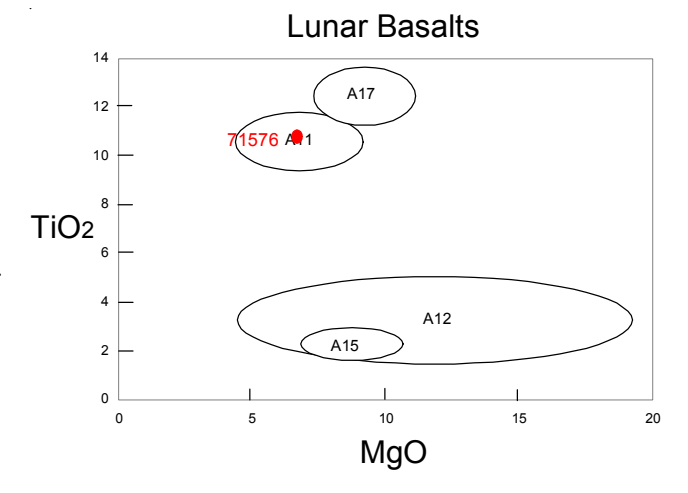Section titled “Chemistry”Murali et al. (1977) give the chemical composition of 30 small Apollo 17 basalts including 71595 and 71576 (figures 4 and 5). These samples have been classified as type B2 by Neal and Taylor (1993).