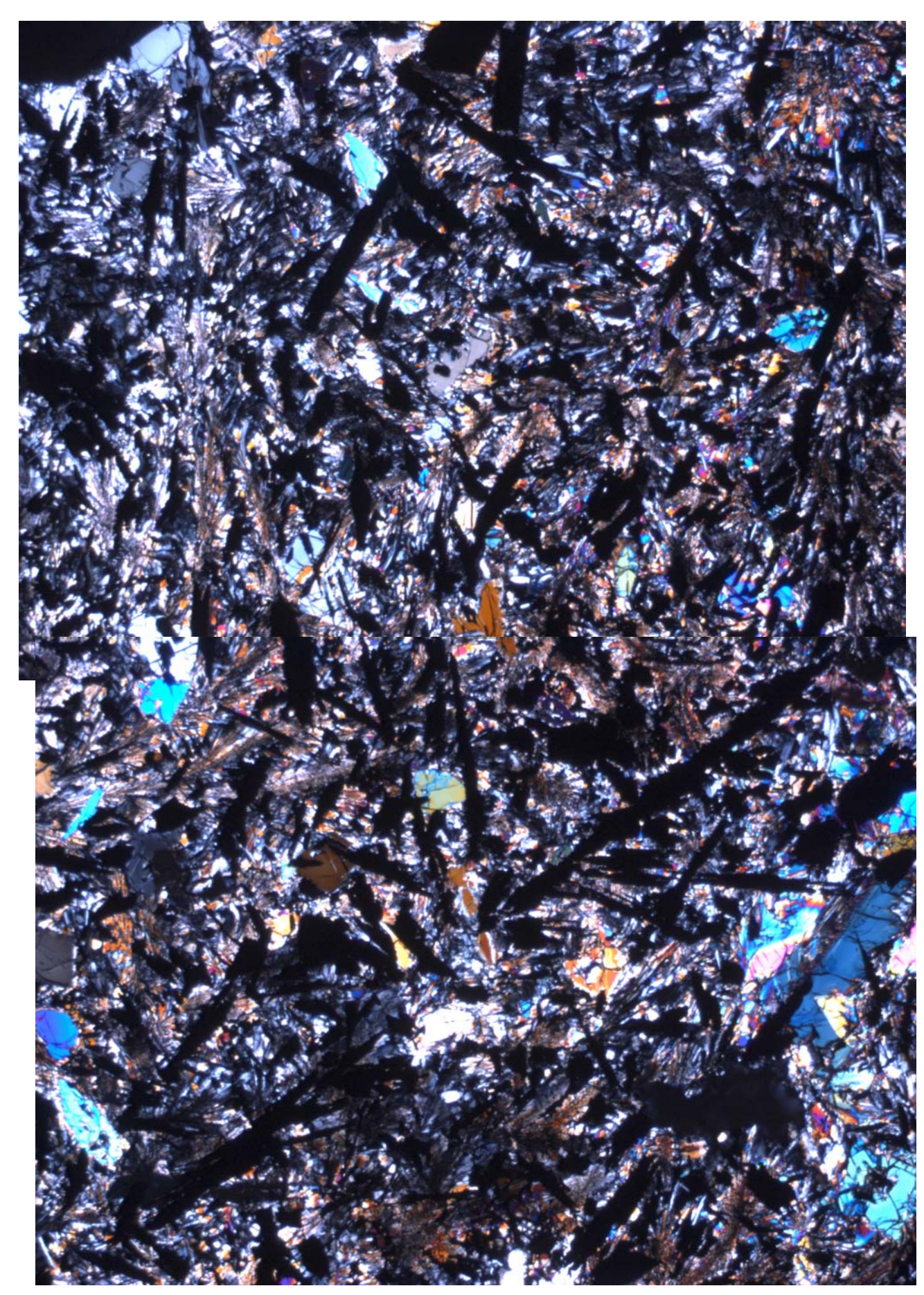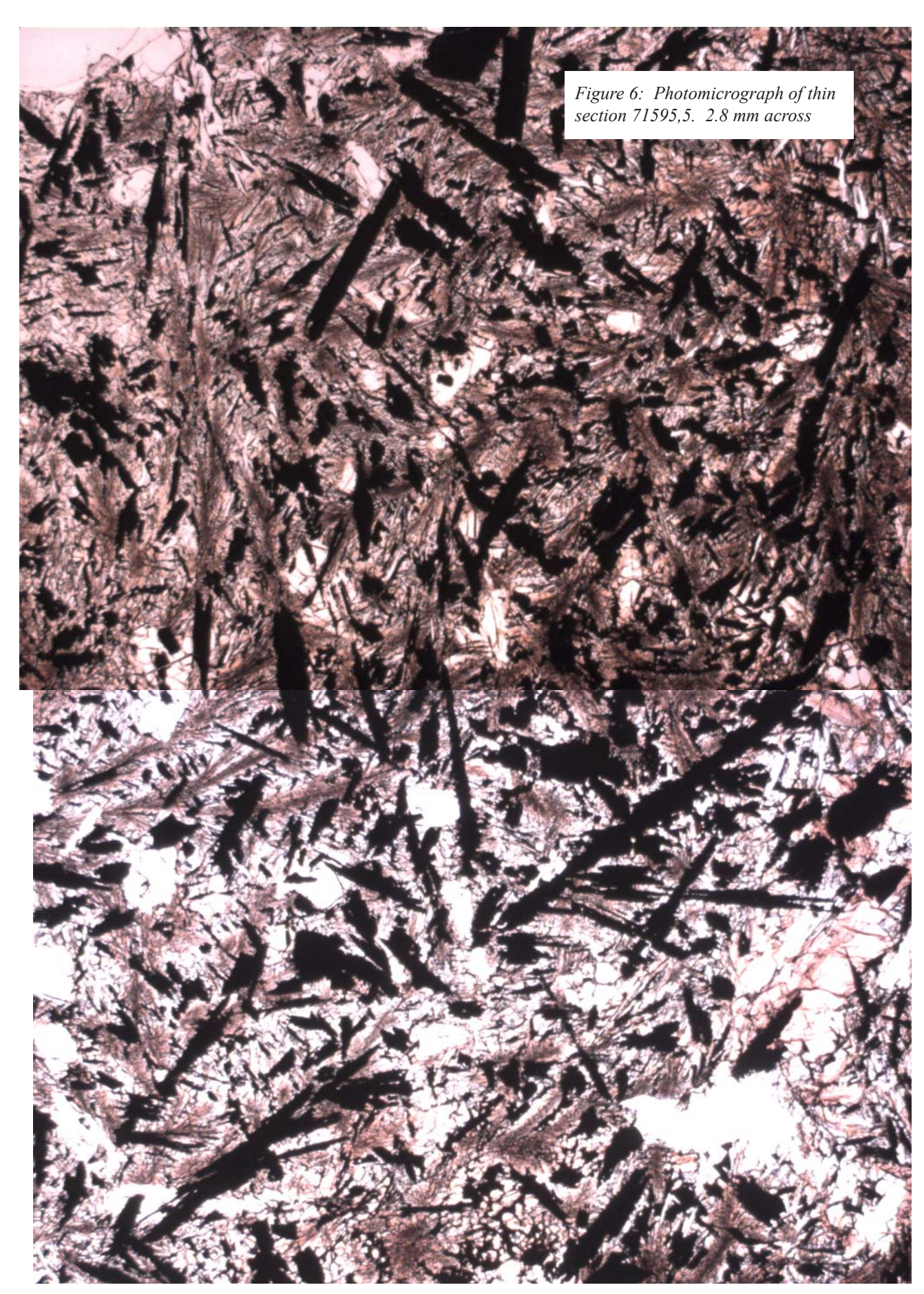 Section titled “Petrography”71595 and 71576 are fine-grained basalts with skeletal olivine and ilmenite phenocrysts in a variolitic groundmass (figures 6 and 7). Armalcolite is present, mantled by ilmenite. Ca-rich pyroxene is zoned to Ferich (figure 3).