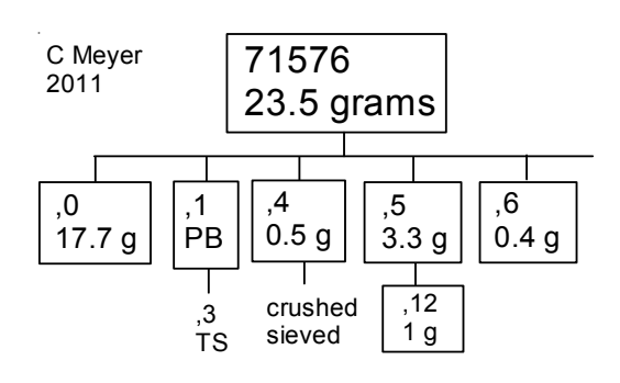 Section titled “References for 71595 and 71576.”Butler P. (1973) Lunar Sample Information Catalog Apollo 17. Lunar Receiving Laboratory. MSC 03211 Curator’s Catalog. pp. 447.
