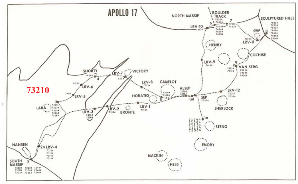Figure 1: Photograph of 10 meter crater at station 3, Apollo 17 showing location of 73210. AS17-138-21160