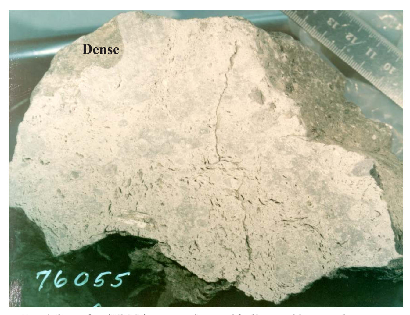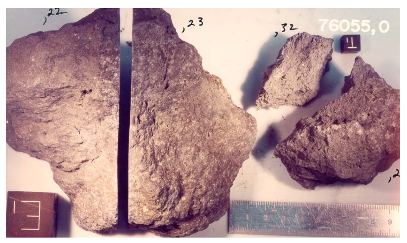 Section titled “Introduction”Sample 76055 was picked up from the lunar regolith at some distance (10-15 meter) from the large Station 6 Boulder, but is probably not derived from it (Wolfe et al. 1981). The hand specimen appeared to be relatively homogeneous and clast free (figure 1), but the thin sections show many minute clasts (figure 3). The rock contains a prominent foliation that is defined by many small lenticular vesicles (or vugs) up to 0.2 x 3 mm in size (figures 2 and 4). Sawn surfaces show three apparent lithologies: a) vesicular, b) nonvesicular meltrock, and c) unstudied dense region (figure 12). All surfaces except B1 are covered by many micrometeorite craters, including one glass splash of about 1 cm, making this rock a potential sample for the study of solar and cosmic ray interactions.