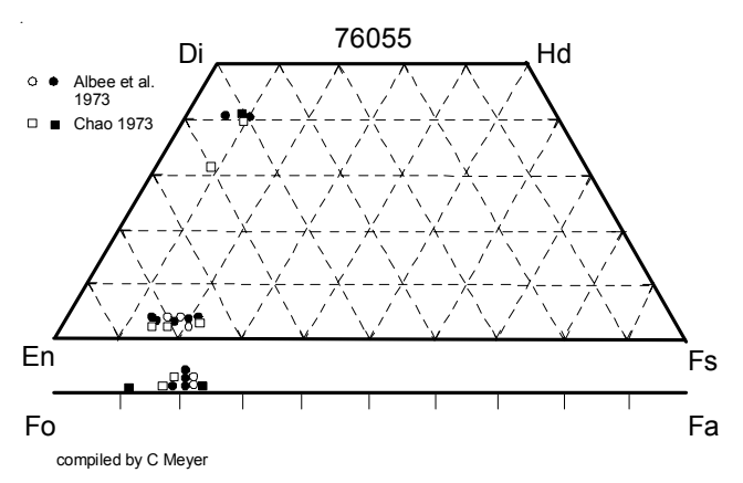 Figure 5: Pyroxene and olivine composition of 76055 (from Chao 1973, Albee et al. 1973).