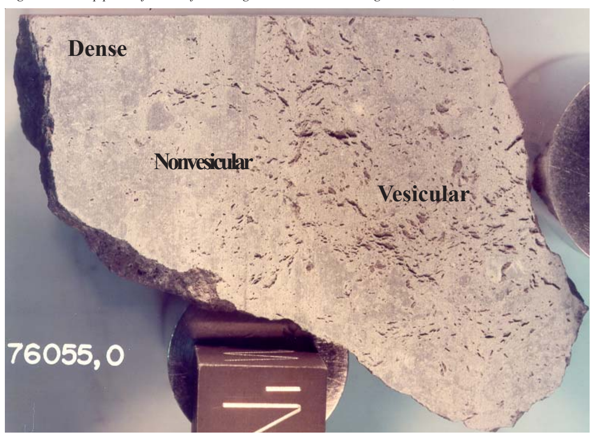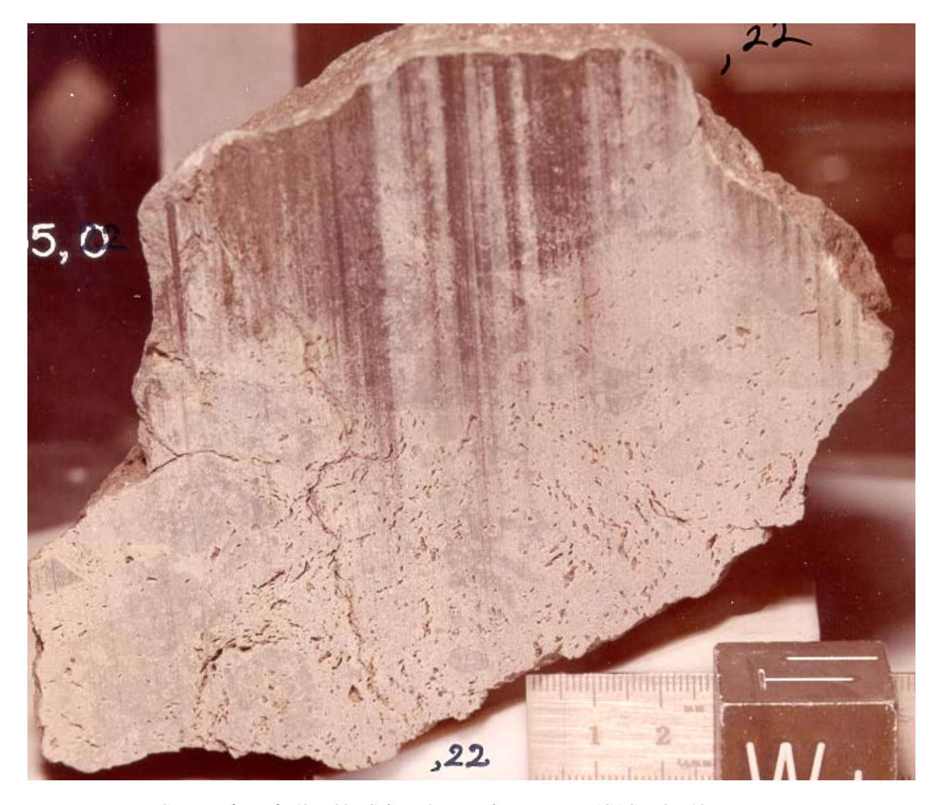 Figure 2: Sawn surface of 76055,0 showing oriented structure defined by vugs and dense material as “clasts”. Scale in cm. NASA S93-045965.