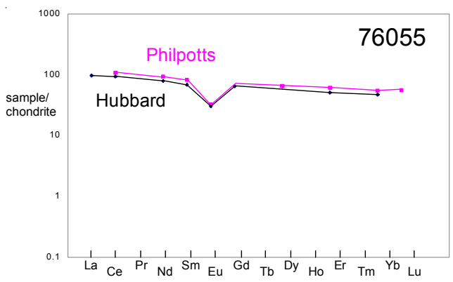 Figure 7: Normalized rare-earth-element diagram for 76055 (data obtained by isotope dilution mass spectrometry, Hubbard et al. 1974, Philpotts et al. 1974).