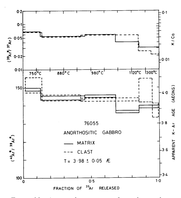 Section titled “Radiogenic age dating”Tera et al. (1974) used a two point Rb-Sr isochron to obtain an age of 3.86 b.y. for 76055. However, Kirsten et al. (1973), Turner et al. (1973), Huneke et al. (1973) and Kirsten and Horn (1974) obtained significantly older ages for the matrix and a clast in 76055 by the Ar/Ar plateau technique (figures 8, 9, 10). Nyquist et