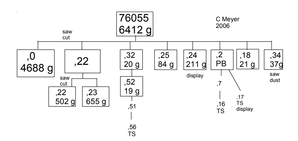 Section titled “Other Studies Processing”Delano (1977) showed that 76055 has olivine as its 76055 was sawn twice, into three chunks, but was not liquidus phase in the pressure range 0 to 23 kbars joined “slabbed” (figure 11). There are 17 thin sections. by orthopyroxene above 23 kbars. He concludes that the bulk 76055 composition does not represent magma derived by partial melting of either cosmic or differentiated source regions at any pressure on the Moon.