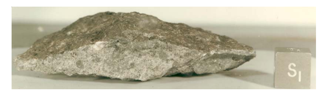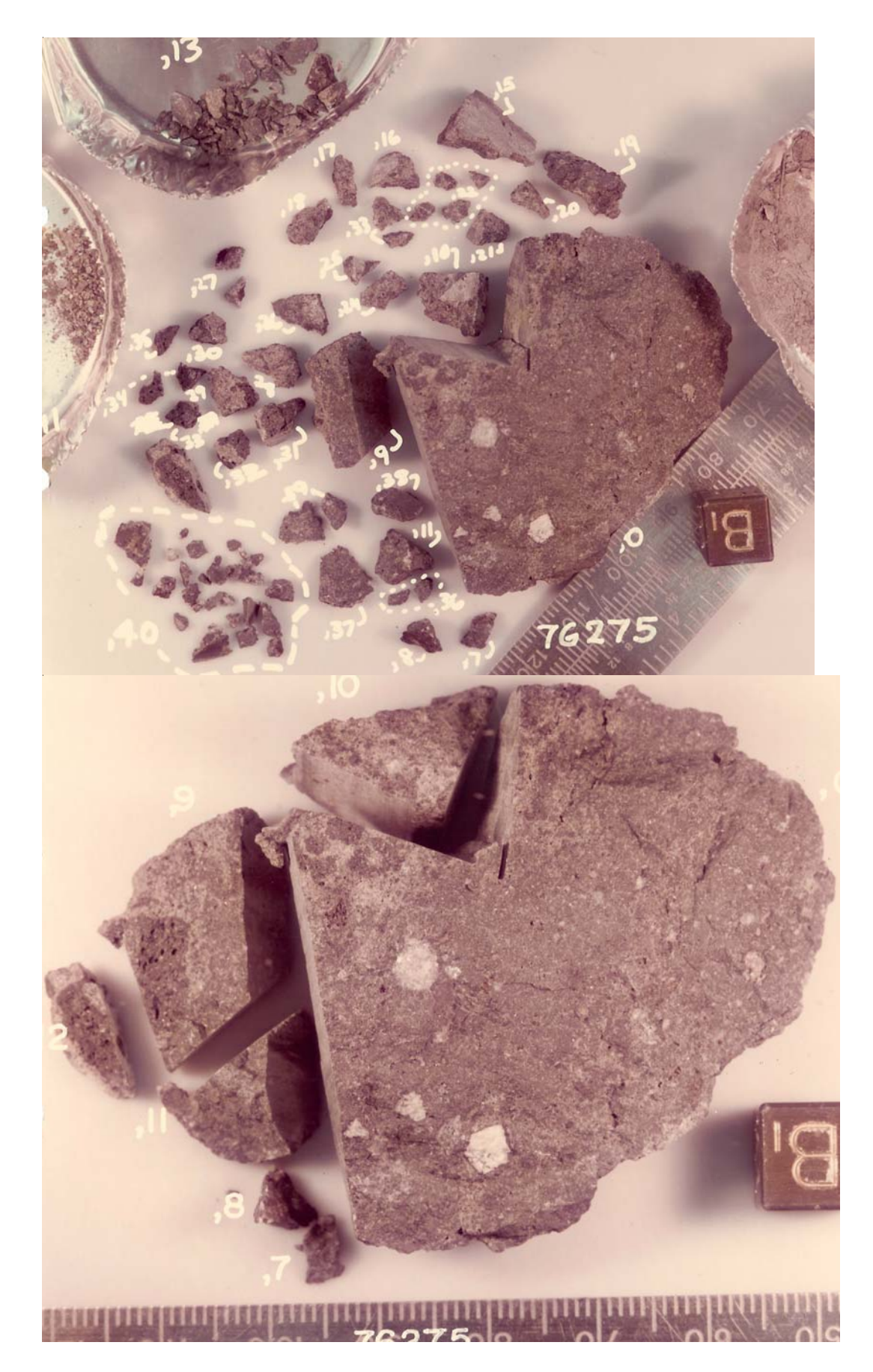 Section titled “Introduction”76275 was chipped off of the side of block 1 of the big boulder at station 6, Apollo 17 (Wolfe et al. 1981). One side is freshly broken, the other side rounded by micrometeorite bombardment and coated with patina (glass splash from the regolith).